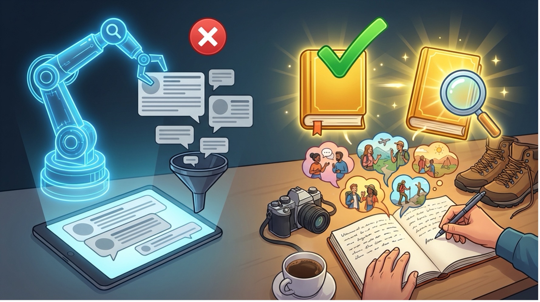 しかし、ご安心ください。AIがどれだけ進化しても、決して代替できない領域、それが「人間の独自性」と「一次情報」に基づくコンテンツです。本記事では、AI検索時代においてWebライターが生き残り、さらに読者の心に深く響く記事を執筆するための実践的な戦略をご紹介します。アルゴリズムの詳細を追いかけるのではなく、「AIには書けない文章」を書くための具体的なステップ、特に「取材」と「体験記」に焦点を当てて解説いたします。