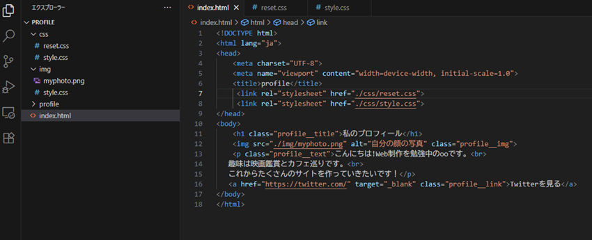 reset.cssでブラウザの違いをリセットし、style.cssで色や文字の大きさ、余白などを整えることで、